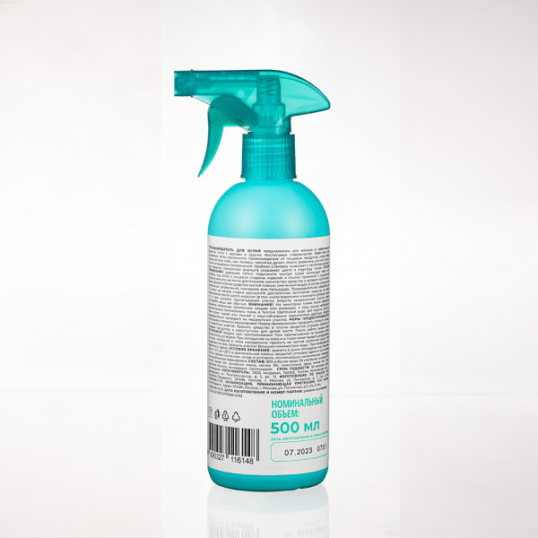 Предварительная обработка: за 1-10 минут до начала стирки распылите достаточное количество средства на особо загрязненные места сухого изделия (в том числе воротники и манжеты рубашек, носки и т.п.). Для лучшего пропитывания слегка потрите загрязненный участок, затем постирайте вещь как обычно.
