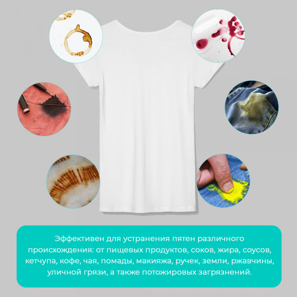 Предназначен для мягкого и эффективного удаления пятен с одежды и других текстильных поверхностей. Эффективен для устранения пятен различного происхождения: от пищевых продуктов, соков, жира, соусов, кетчупа, кофе, чая, помады, макияжа, ручек, земли, ржавчины, уличной грязи, а так же потожировых загрязнений. Удобная упаковка позволяет с легкостью использовать средство. Уникальная формула сохраняет цвета и структуру тканей.