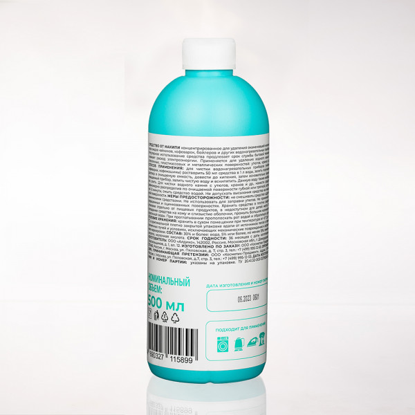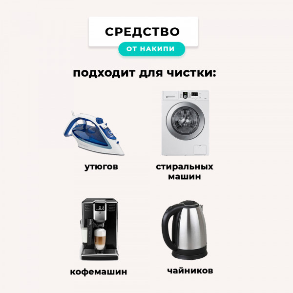 Концентрированное средство для удаления окаменевшей накипи со всех видов чайников, кофеварок, бойлеров и других водонагревательных приборов. Регулярное использование средства продлевает срок службы бытовой техники и снижает расход электроэнергии. Применяется для удаления водного камня со стеклянных, пластмассовых и металлических поверхностей: утюгов, кранов и др.