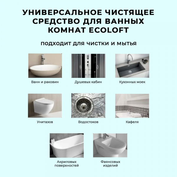 Безопасно и эффективно для очищения плитки, кафеля, раковин, смесителей и кранов, биде, ванн и душевых кабин, нержавеющей стали, керамических, пластиковых, акриловых поверхностей от типичных для ванн общих загрязнений, известково-кальциевых отложений, мыльного налета, ржавчины. Придает очищенным поверхностям блеск. Содержит компонент, обладающий антибактериальным эффектом, а «зеленый растворитель» защищает от царапин. Устраняет неприятные запахи, придает свежесть, облегчает последующие очищения, сохраняет чистоту длительное время